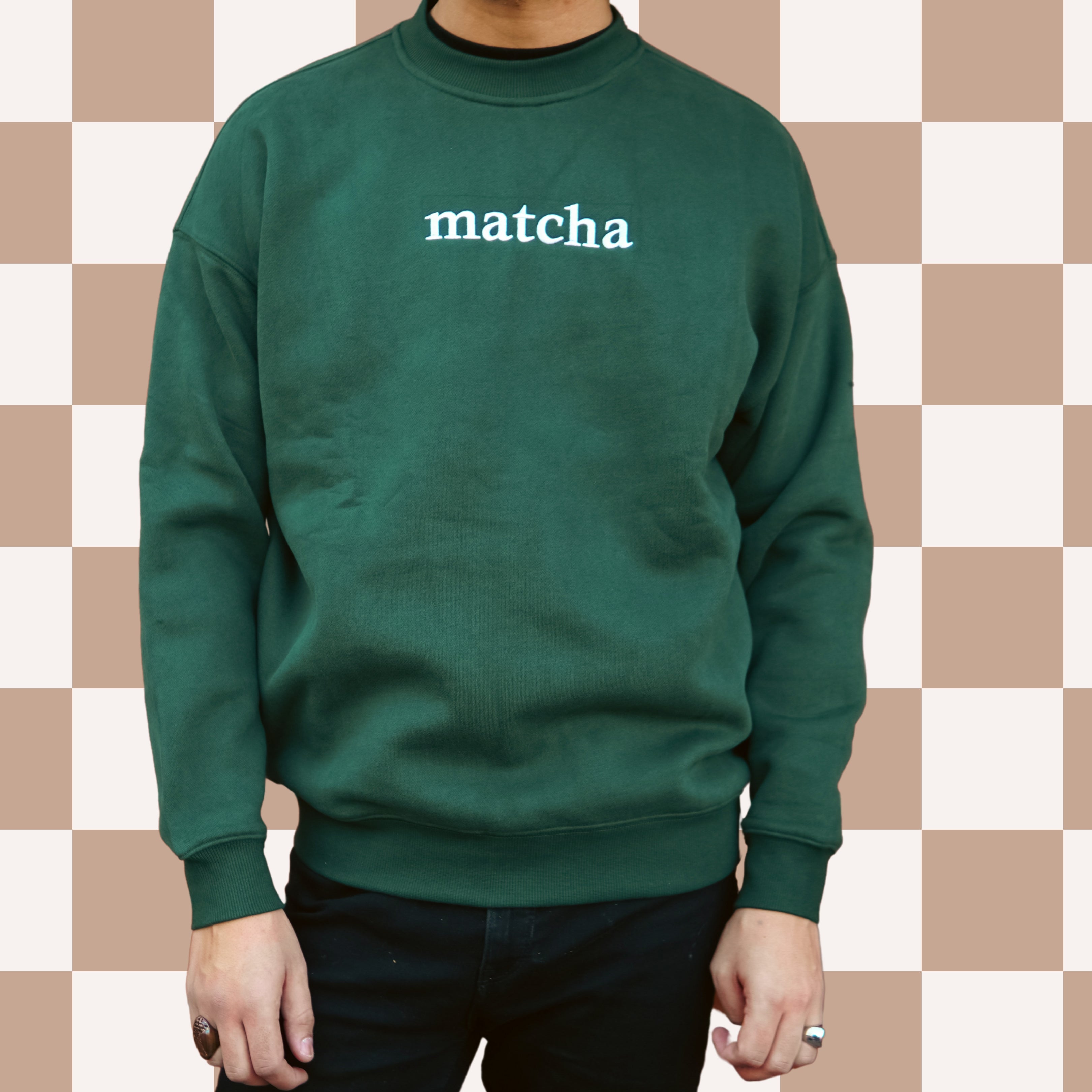 Our dark forest green "matcha" crewneck is custom embroidered with white lettering and perfect for any occasion.